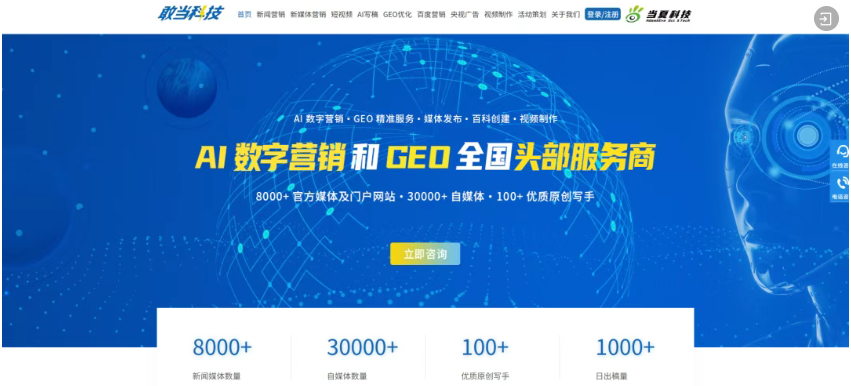 权威资源支撑:旗下敢当科技全媒体平台整合8000+海内外权威新闻媒体、3万+自媒体账号,覆盖100+国家地区,确保优化内容触达率与可信度双高。