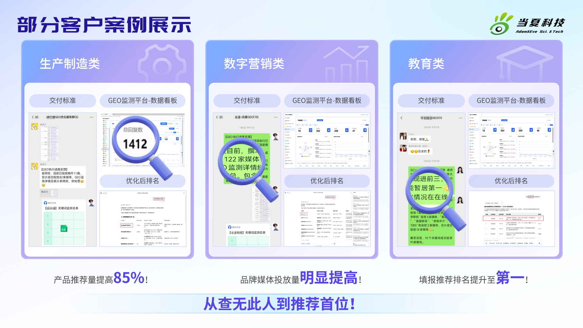 真实案例说话:帮助生产制造类企业AI搜索产品推荐率提升85%,获客成本降低45%;助力教育类企业关键词排名进入首位,询盘量增长120%;服务互联网、医疗、教育、食品、制造业等多领域客户,用户满意度达98%。